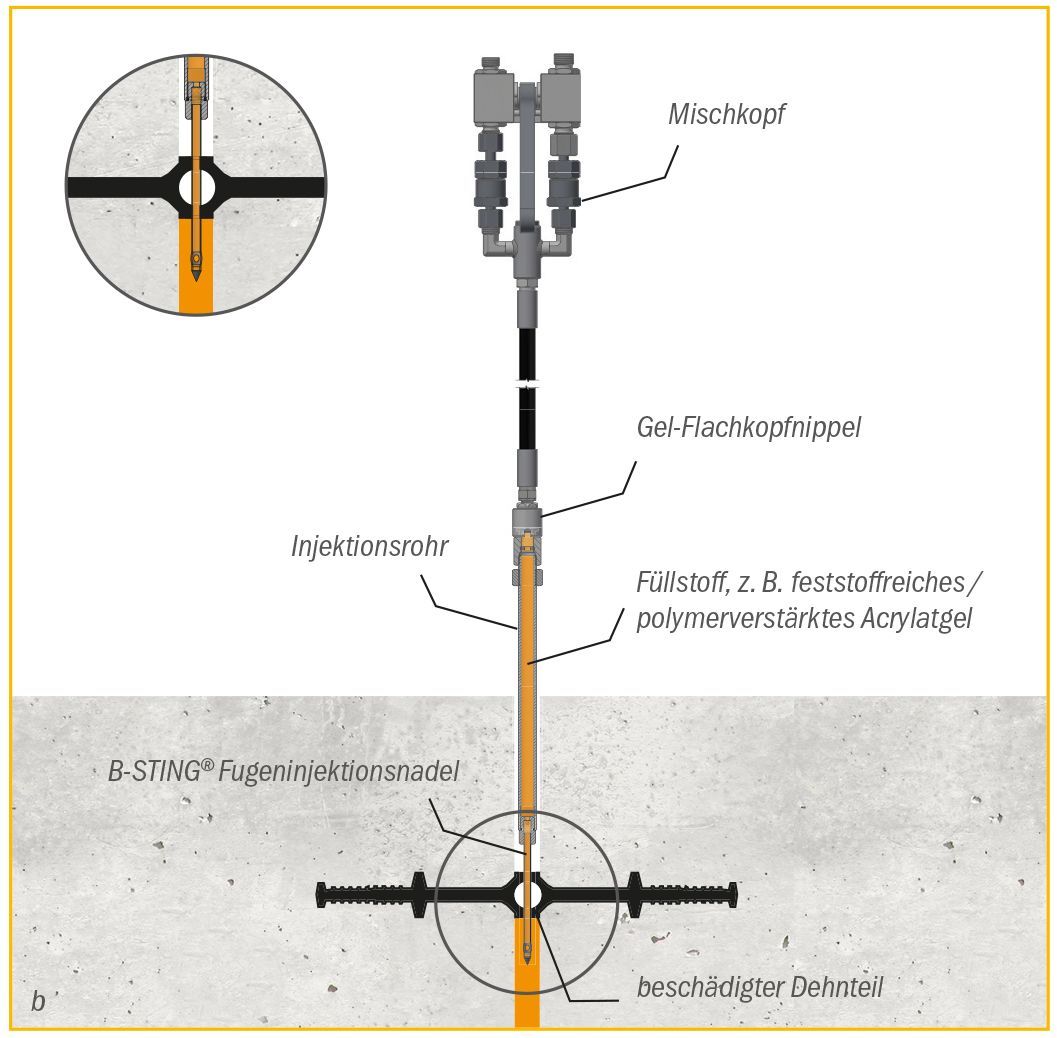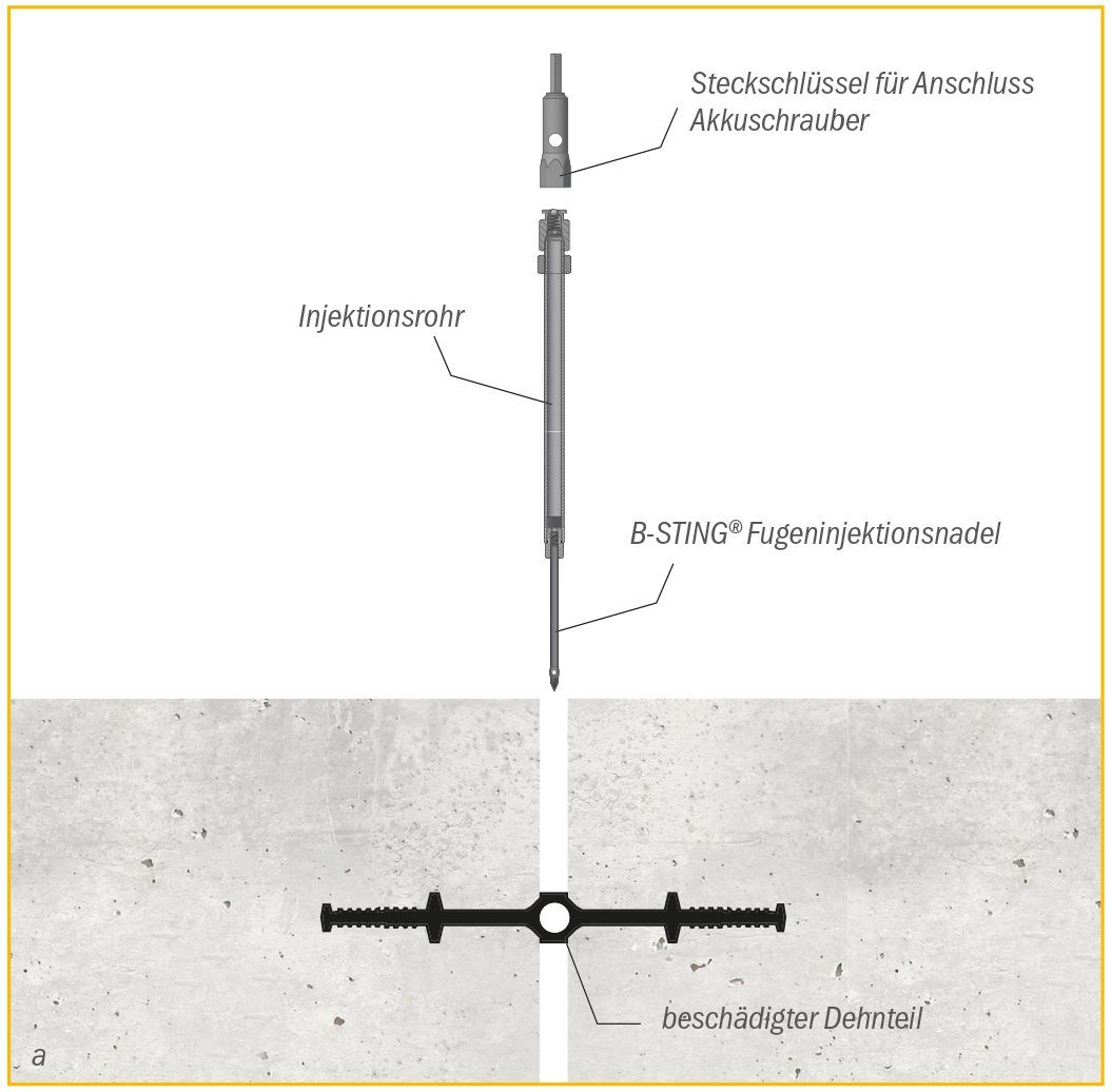 Bei dem Verfahren wird die Fugeninjektionsnadel B-STING® mittels Akkuschrauber in die Bewegungsfuge durch das Dichtungselement eingedreht. Über einen Gel-Flachkopfnippel und das auf die B-STING®® aufgeschraubte Injektionsrohr erfolgt die Injektion in die wasserzugewandte Seite der Fuge. Nach dem Injektionsvorgang wird das Injektionsrohr entfernt, während die B-STING® in der Dichtungverbleibt und den Injektionspunkt dauerhaft und druckwasserdicht verschließt.