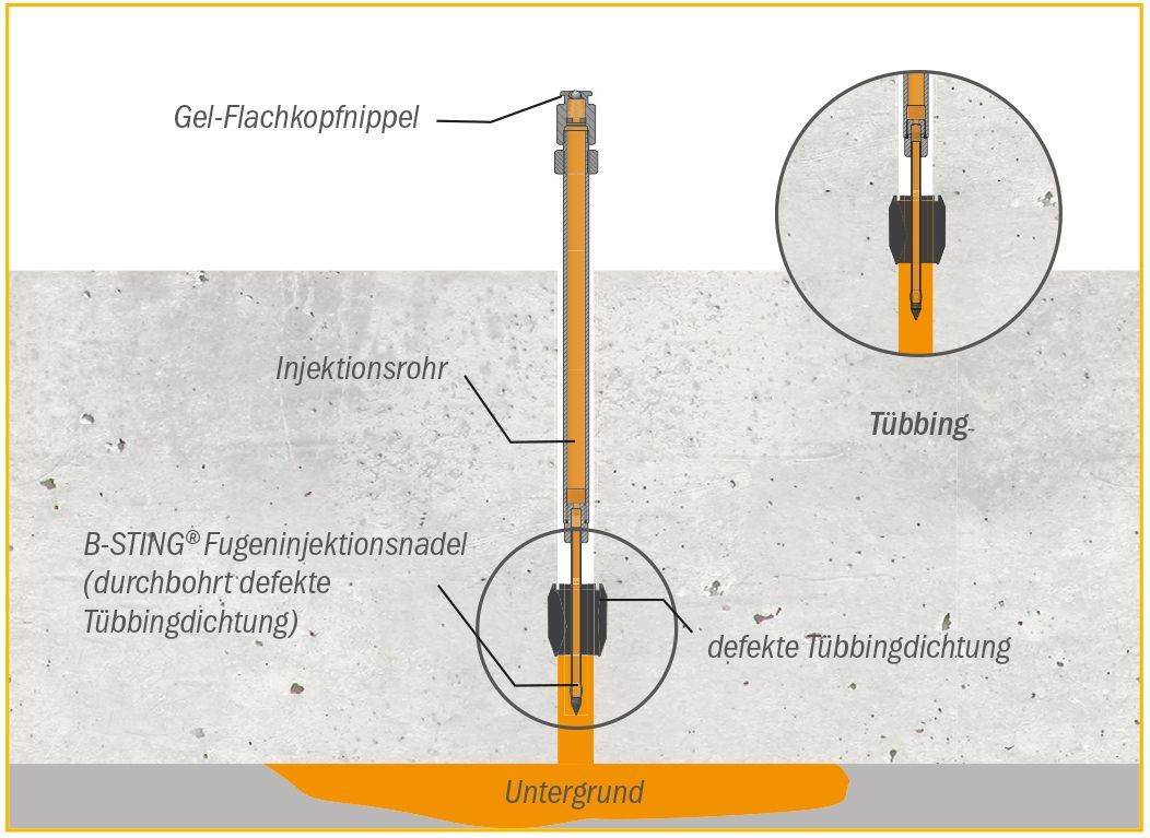 Bei der nachträglichen Abdichtung von Tübbings ist die Vorgehensweise grundsätzlich identisch. Bei dem Verfahren wird die Fugeninjektionsnadel B-STING® mittels Akkuschrauber über die Tübbingfuge in die Tübbingdichtung eingedreht und durchdringt die Tübbingdichtung. Über einen Gel-Flachkopfnippel und das auf die B-STING® aufgeschraubte Injektionsrohr erfolgt die Injektion eines Füllstoffs auf Acrylat- oder Polyurethanbasis in die Tübbingfuge. Bei Tübbings ist wegen der geringeren Fugenweite in der Regel jedoch ein Aufbohren der Längs- oder Ringfugen der Tübbings erforderlich, um das Injektionsrohr mit der B-STING® Fugeninjektionsnadel in die Fuge einführen zu können. Die B-STING® Fugeninjektionsnadel verbleibt in der Tübbingdichtung und dichtet den Injektionspunkt dauerhaft ab.