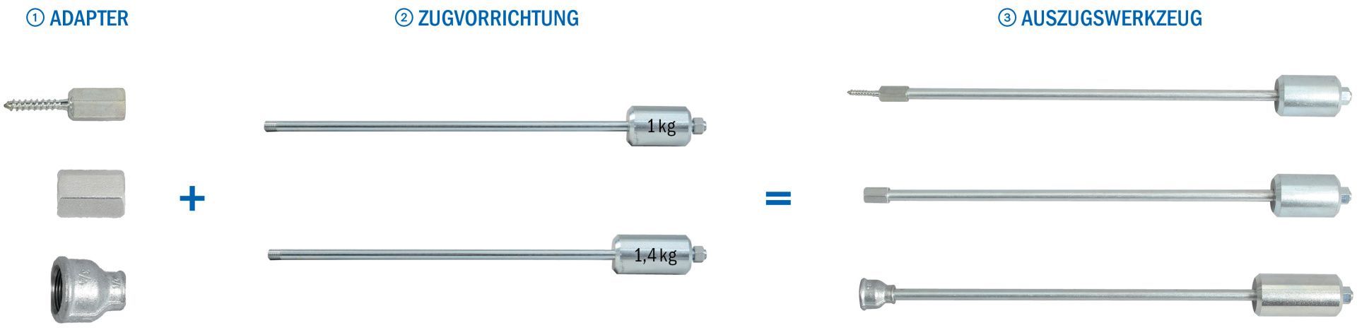 Um Lamellenschlagpacker aus dem Bauteil zu entfernen, stehen verschiedene Auszugswerkzeuge zur Verfügung, die je nach Packerart variieren. Das Auszugswerkzeug wird auf den Lamellenschlagpacker ein- oder aufgeschraubt und das Gewicht nach hinten geschlagen. Schritt für Schritt löst sich der Packer aus dem Bauteil.- Basis: Zugvorrichtung