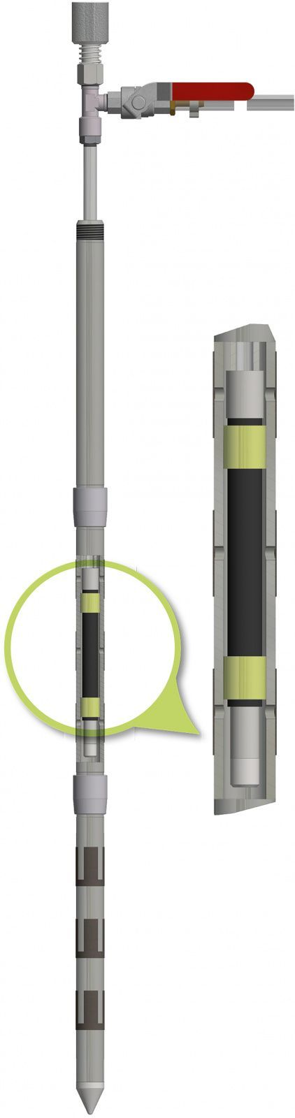 - Der Druck muss vor Beginn der Injektion auf 25 bar begrenzt werden, ansonsten besteht die Gefahr, dass der Blähpacker Schaden nimmt und ein weiteres Arbeiten nicht mehr möglich ist