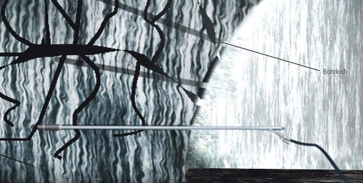 Mit Hilfe der 4 axialen Spannschrauben wird der Doppelpacker fest im Bohrloch verspannt. Durch das Injektionsrohr wird nun das Abdichtungsmaterial in die Fehlstellen, die aufgrund des Durchbohrens der Kunststoffdichtungsbahn entstanden sind, eingebracht, um die Dichtigkeit wiederherzustellen. Über die Materialleitung im Ankerstrumpf kann der DESOI Ankermörtel in das Bohrloch eingefüllt werden.