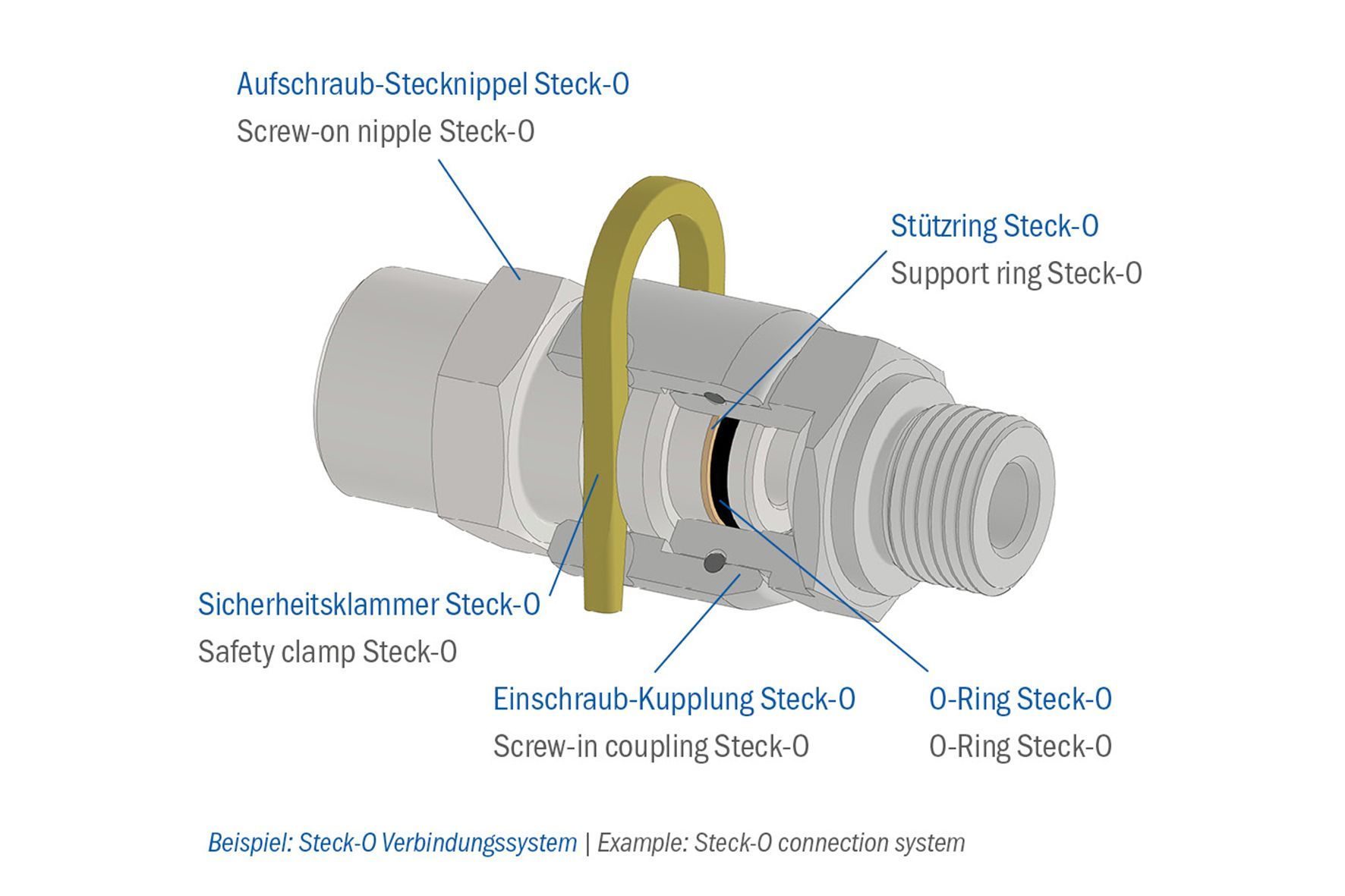 Bei dem einfach zu montierenden Steck-O System wird die gewindelose Verbindung durch eine U-förmige Klammer zusammengehalten. Der Aufschraub-Stecknippel Steck-O hat die Dichtung und eine Nut für die Klammer. Er wird in den Einschraub-Stecknippel Steck-O eingeschoben und durch die Klammer fixiert. Das Ergenis ist eine sichere Verbindung für Hochleistungsanwendungen und lässt sich ebenso leicht demontieren wie montieren.