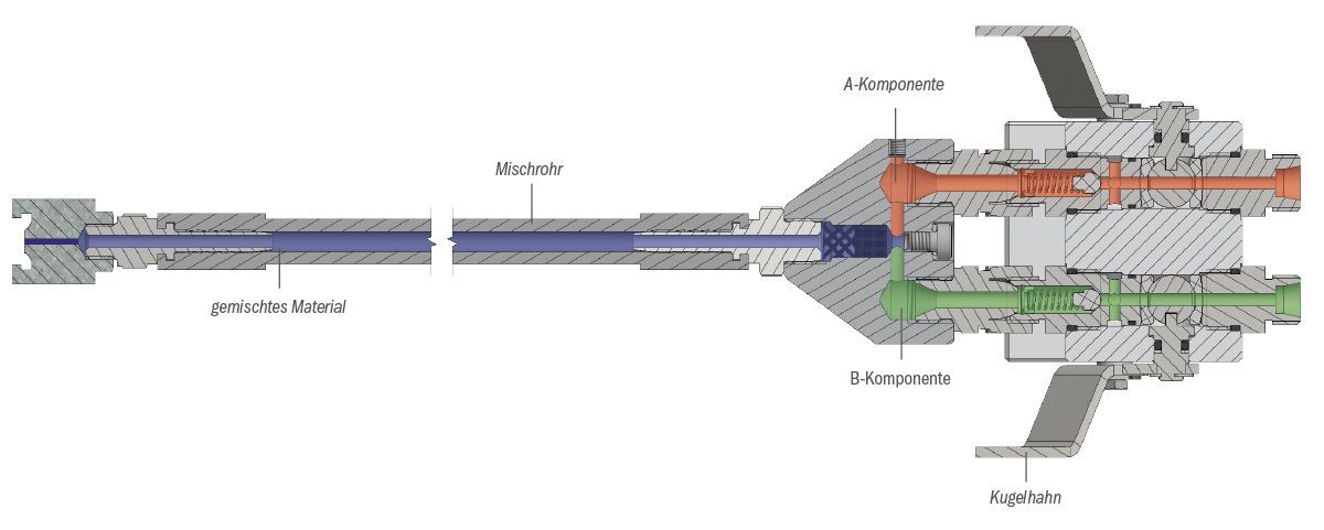 Bei den Mischköpfen werden die A- und B-Komponente kurz vor dem Statik-Gittermischer zusammengeführt und im Statik-Gittermischer gemischt. Durch die beiden Rückschlagventile fliest das Material nicht in die Materialschläuche zurück. Die Mischstrecke kann durch unterschiedliche Mischrohre und die Anzahl der Statik-Gittermischer an das Injektionsmaterial angepasst werden.