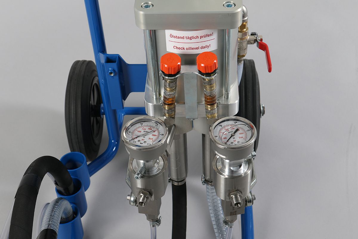 Die Kolbenpumpe DESOI AirPower M25-2C ist mit einer Zwangssteuerung ausgestattet. Sie fördert das Material im festen Mischungsverhältnis 1:1. Eine hohe Förderleistung und Mischgenauigkeit werden durch die großen und exakt arbeitenden Ventile erzielt. Die Pumpe ist sehr wartungsfreundlich und verschleißarm. Durch ihr geringes Gewicht ist diese flexibel auf der Baustelle einsetzbar.