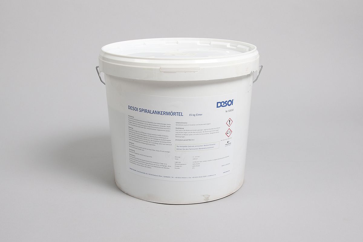 DESOI spiral anchor mortar is used to create a force-fit connection between the spiral anchors and the masonry types. The original masonry mortar should be analysed for any salts or gypsum/anhydrite components that may be harmful to the building. DESOI spiral anchor mortar is not suitable for masonry containing gypsum. Another use of the spiral anchor mortar is the subsequent anchoring of facing brickwork shells and natural stone cladding to the load-bearing shell. (Connection of non-load-bearing masonry shells to the load-bearing masonry with spiral anchors!) The spiral anchor mortar can also be used to secure and stabilise masonry elements.